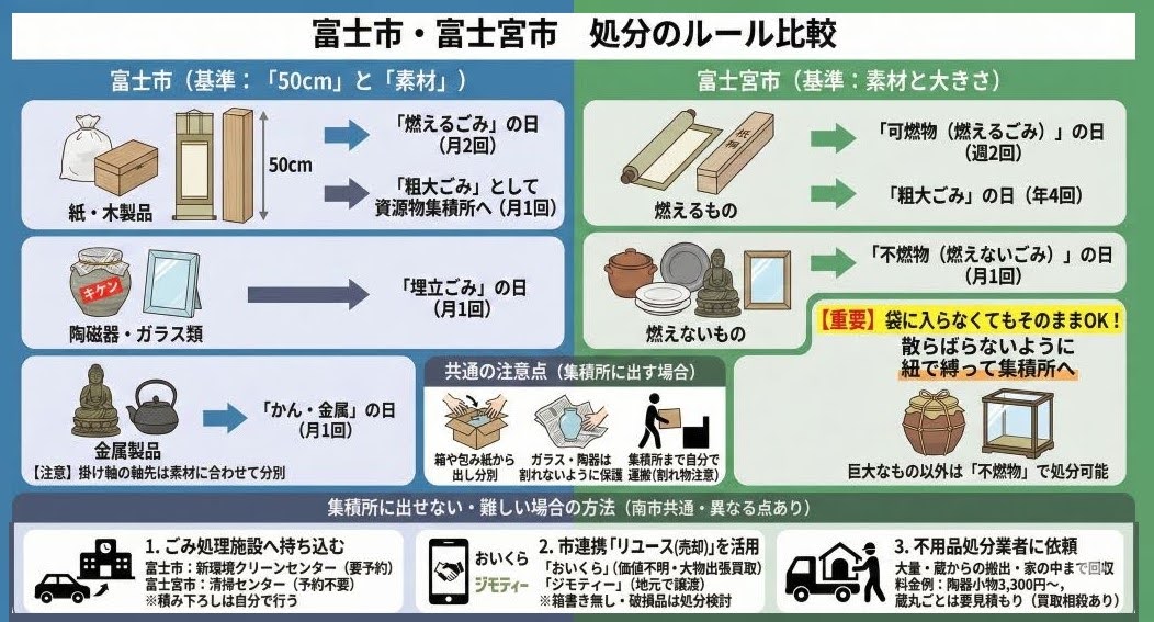 また、富士市・富士宮市ともに一般の戸別収集がないため、「家の中や庭まで取りに来てほしい」という方には唯一の選択肢となります。