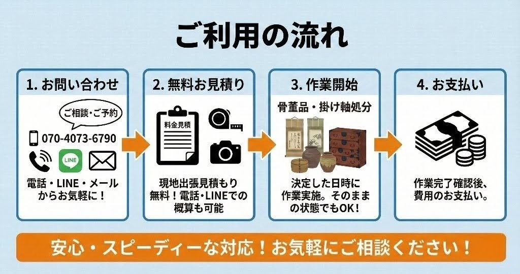 骨董品や掛け軸は、丁寧に扱う必要があり、量が多いと梱包や運び出しも重労働です。「自分では手が付けられない」「今すぐスッキリさせたい」という方は、ぜひお気軽にご相談ください。