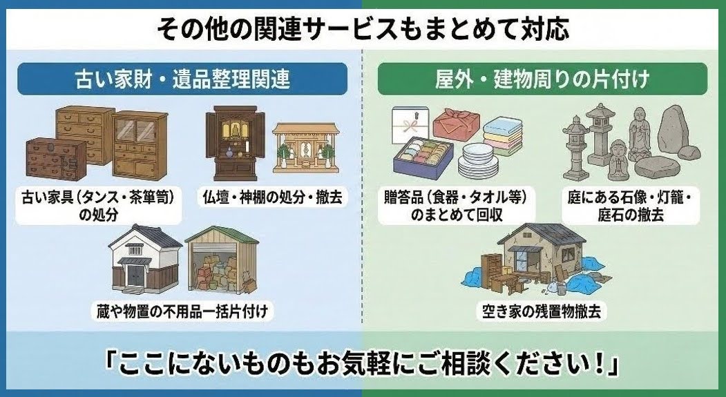 骨董品・掛け軸の処分と合わせて、以下の関連サービスも大変ご好評いただいております。遺品整理や実家の片付けの際に、セットでご依頼いただくことが多い人気メニューです。