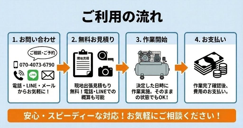 コンプレッサーを持ち運んだり、搬出したりするのは大変な重労働です。「面倒くさい」「今すぐ処分したい」という方は、ぜひお気軽にご相談ください。