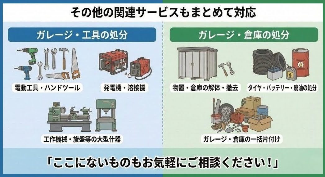 コンプレッサーの処分と合わせて、以下の関連サービスも大変ご好評いただいております。特に「ガレージの不用品」や「電動工具」の処分は、コンプレッサーとセットでご依頼いただくことが多い人気メニューです。
