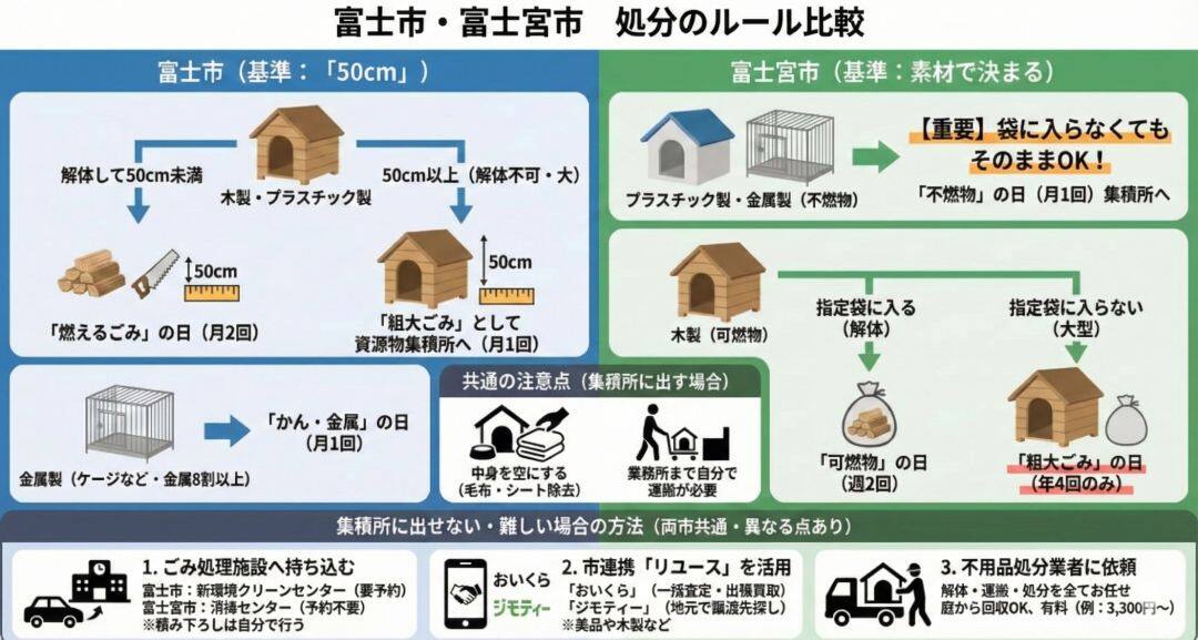 【重要】袋に入らなくてもOK: 富士宮市では、指定袋に入らない大きさの不燃物(ドッグガレージやプラ製犬小屋)でも、袋に入れずにそのまま集積所に出すことができます。年4回の回収を待つ必要はありません。