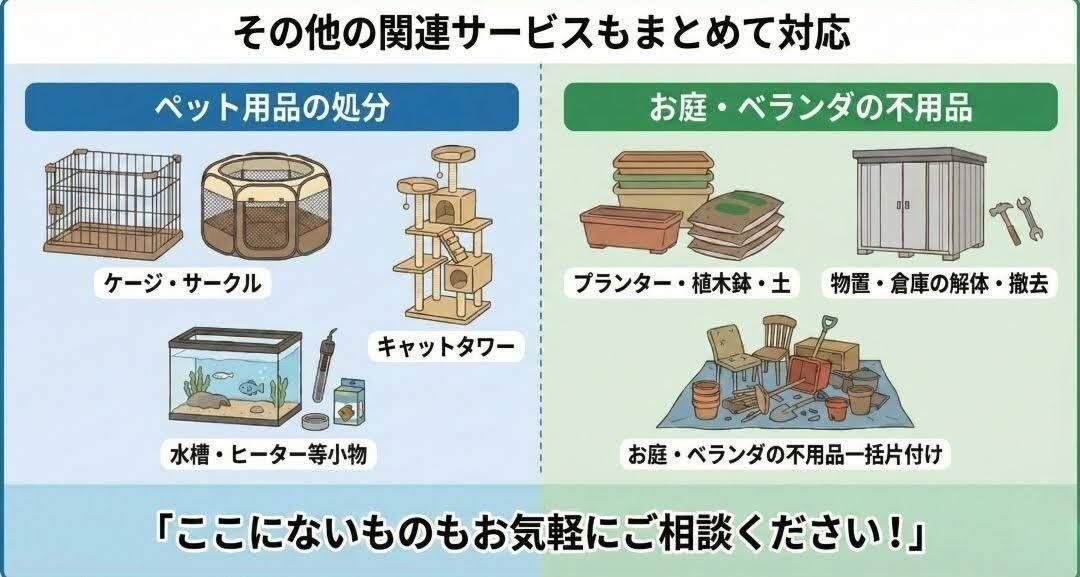 犬小屋・ドッグガレージの処分と合わせて、以下の関連サービスも大変ご好評いただいております。特に「ペット用品」や「お庭の不用品」の処分は、犬小屋とセットでご依頼いただくことが多い人気メニューです。