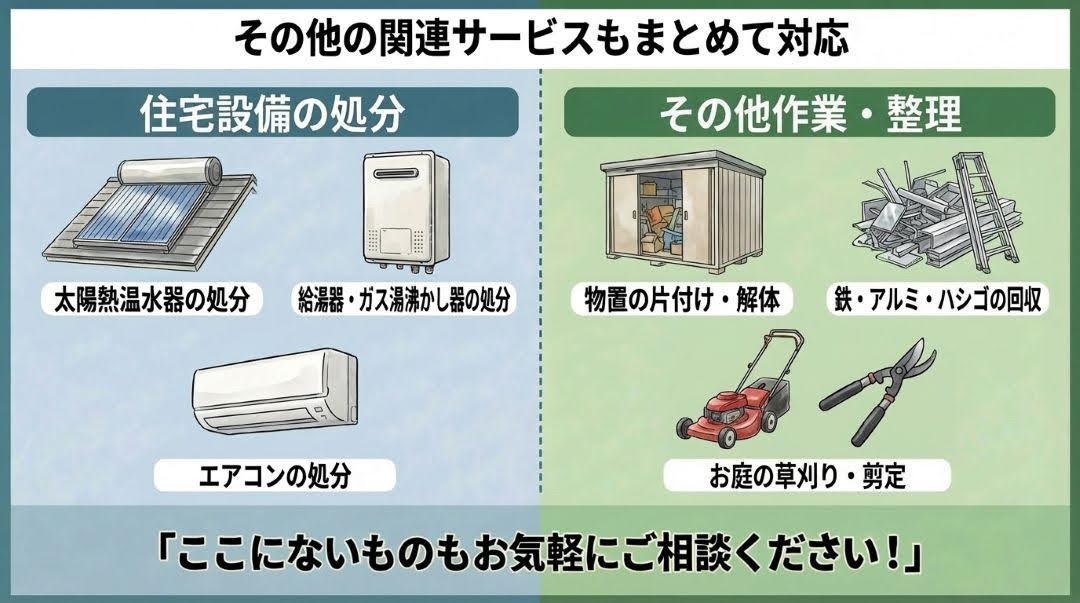 エコキュートの処分と合わせて、以下の関連サービスも大変ご好評いただいております。特に「屋外設備」の撤去や「住宅まわり」の整理は、不用品処分とセットでご依頼いただくことが多い人気メニューです。