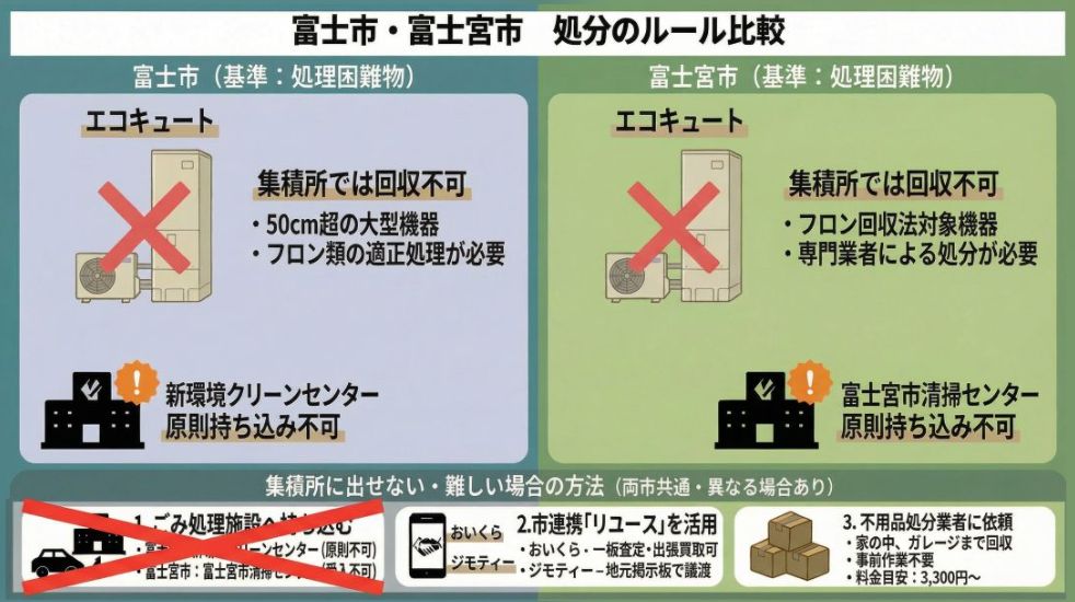 エコキュートは「処理困難物」に指定されており、富士市・富士宮市ともに集積所では回収していません。