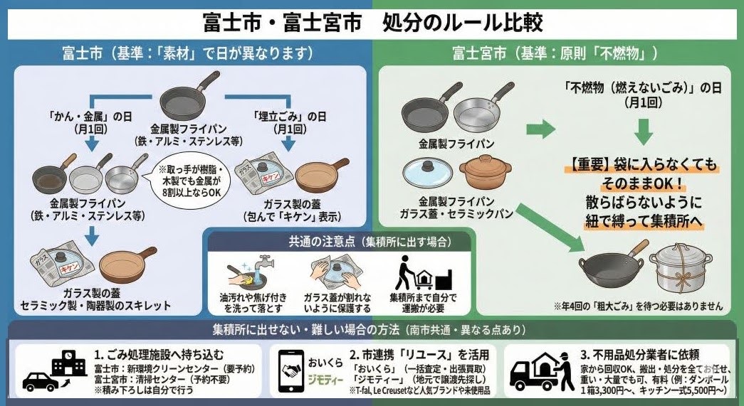 富士市・富士宮市では、フライパンのサイズや素材によってゴミの区分が異なり、大型のものや大量にある場合はご自身でクリーンセンターへ持ち込む必要があります。しかし、油汚れがひどいものを洗ったり、重い鉄製の中華鍋やグリルパンを集積所まで運んだり、素材ごとに細かく分別したりするのは意外と手間で気が重い作業です。