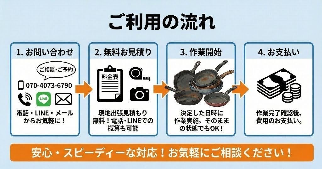 スタッフが現地へ出張し、無料でお見積りさせていただきます。 お電話やLINEで、フライパンの種類(テフロン、鉄製、中華鍋など)や個数をお伝えいただければ、概算金額をお出しすることも可能です。