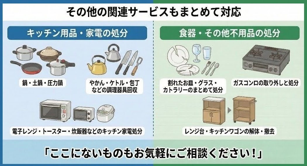 フライパンの処分と合わせて、以下の関連サービスも大変ご好評いただいております。キッチン周りの整理や、お引越し前の片付けの際にセットでご依頼いただくことが多いメニューです。