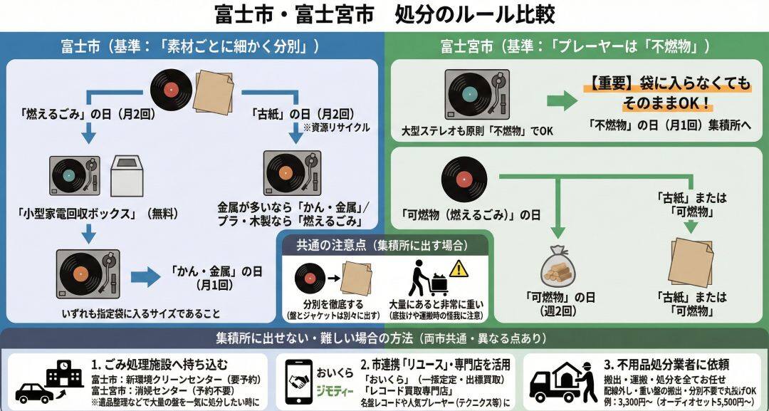 行政の回収に出すのが一番安く済みます。 ただし、レコード盤(ビニール素材)、紙のジャケット、機械本体(プレーヤー)でそれぞれ区分が異なります。また、富士市と富士宮市でもルールが違うため、正しい分別が必要です。