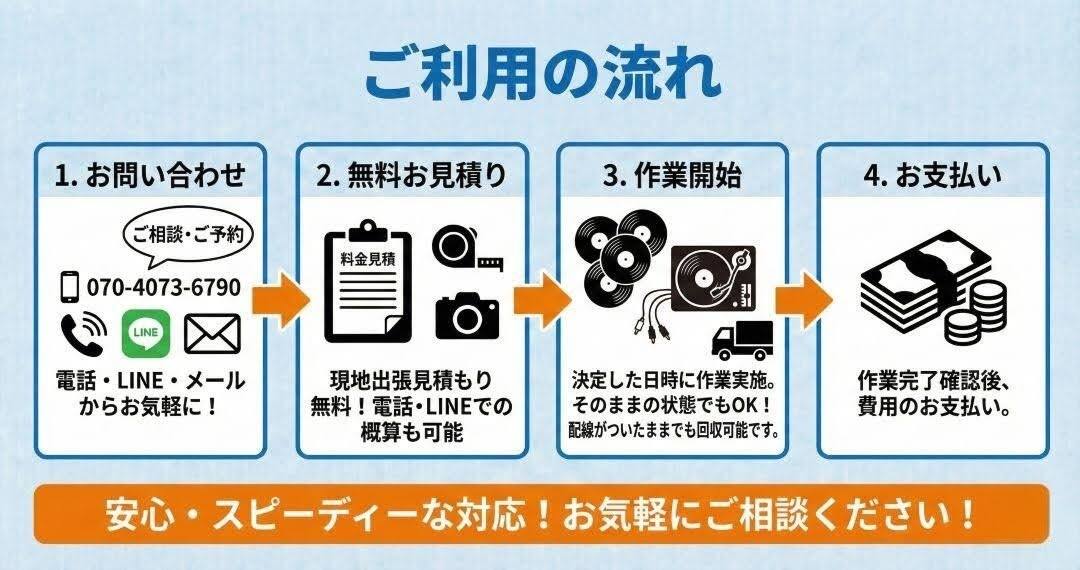レコード・レコードプレーヤーを持ち運んだり、買取店舗を探すのは意外と手間がかかります。 「面倒くさい」「今すぐ処分したい」という方は、ぜひお気軽にご相談ください。