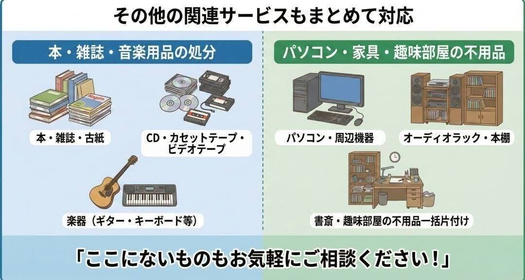 レコード・レコードプレーヤーの処分と合わせて、以下の関連サービスも大変ご好評いただいております。特に「本・雑誌」の処分や「オーディオラック」の撤去は、趣味の部屋の片付けとしてセットでご依頼いただくことが多い人気メニューです。