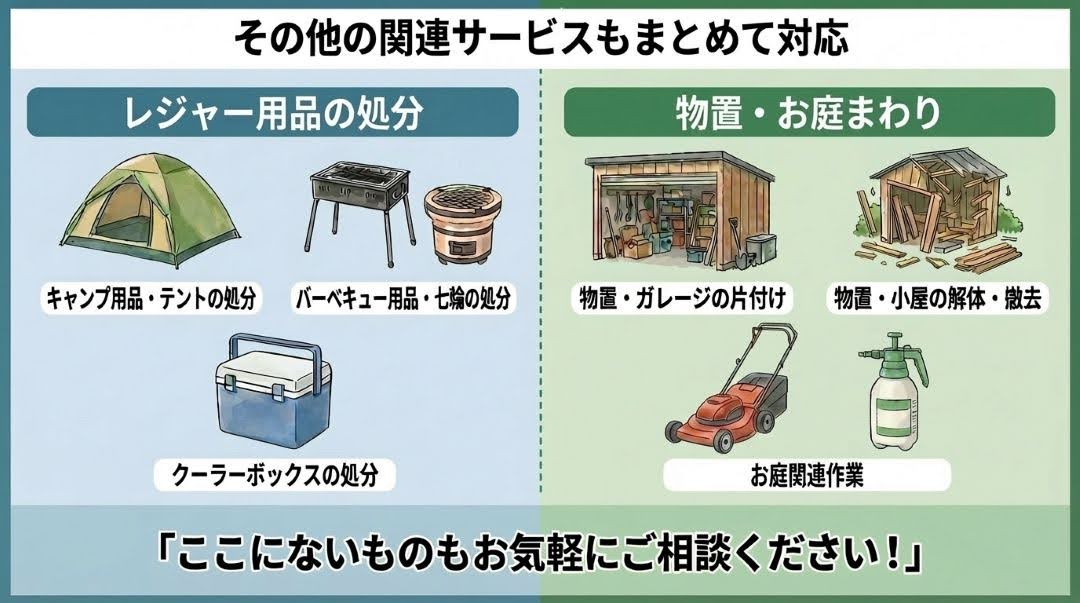 大きなテント・タープの処分と合わせて、以下の関連サービスも大変ご好評いただいております。特に「レジャー用品」の整理や「物置の片付け」は、不用品処分とセットでご依頼いただくことが多い人気メニューです。