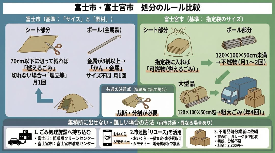 ※富士市・富士宮市では、行政による「自宅までの戸別収集」は原則ありません。以下のいずれかの方法で処分を検討してください。
