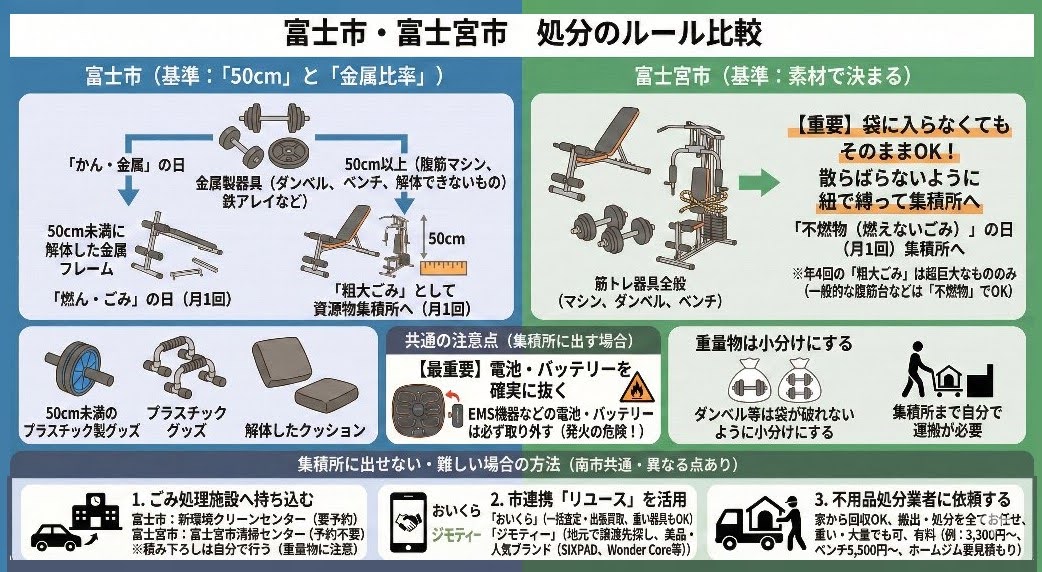 行政の回収(集積所)を利用するのが最も費用を抑えられます。基本的には無料で処分可能です。 ただし、腹筋マシン(シットアップベンチ)やEMS機器は、素材(金属・スポンジ・プラスチック)が組み合わさっているため、サイズと「電池」の確認が重要です。