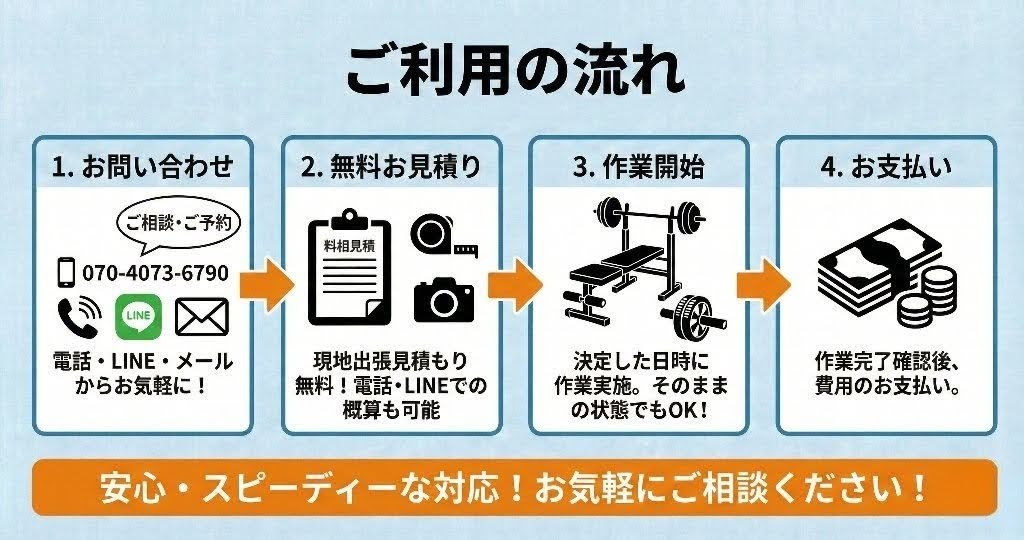 筋トレマシンは鋼鉄製のパーツが多く、1つひとつの部品が非常に重いため、ご自身で解体・搬出するのは怪我のリスクが伴います。「ボルトが固くて外れない」「床を傷つけそうで怖い」という方は、ぜひお気軽にご相談ください。