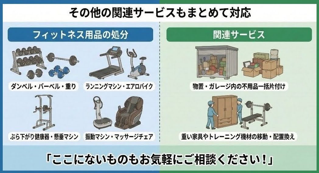 筋トレマシン・腹筋マシンの処分と合わせて、以下の関連サービスも大変ご好評いただいております。ホームジムの撤去や、お引越し、お部屋の用途変更の際にセットでご依頼いただくことが多いメニューです。