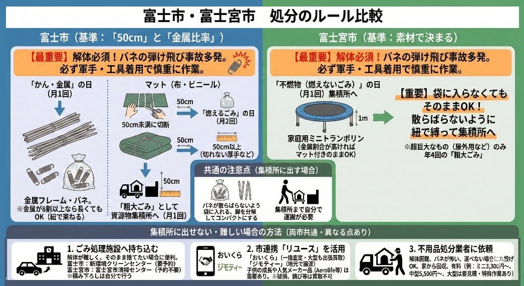 行政の回収(集積所)を利用するのが最も費用を抑えられます。基本的には無料で処分可能です。 ただし、トランポリンは「金属フレーム」「布(マット)」「バネ(スプリング)」で構成されており、そのままでは出せません。分解作業が必須となります。