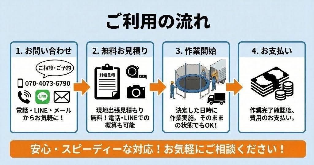 トランポリンは頑丈なスチールフレームと強力なスプリング(またはゴム)で構成されており、分解するにはかなりの力が必要です。また、サイズも大きいため「粗大ごみ」扱いになることが多く、運び出しに苦労する品目です。「重くて運べない」「分解が怖い」という方は、ぜひお気軽にご相談ください