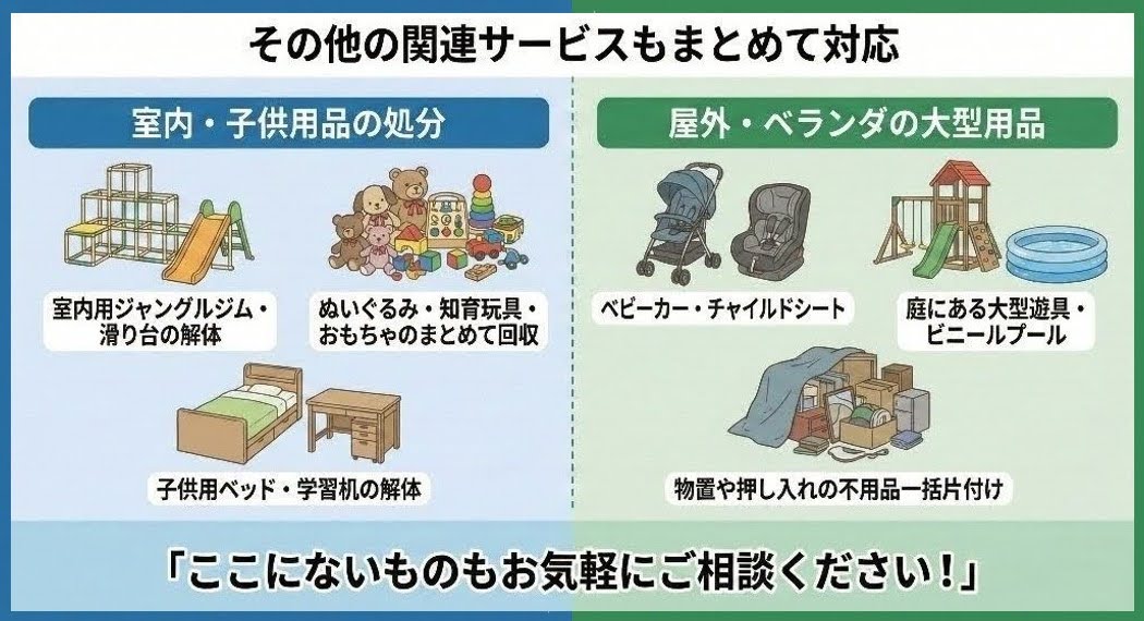 トランポリンの処分と合わせて、以下の関連サービスも大変ご好評いただいております。お子様の成長に伴うお部屋の片付けや、お引越しの際にセットでご依頼いただくことが多いメニューです。