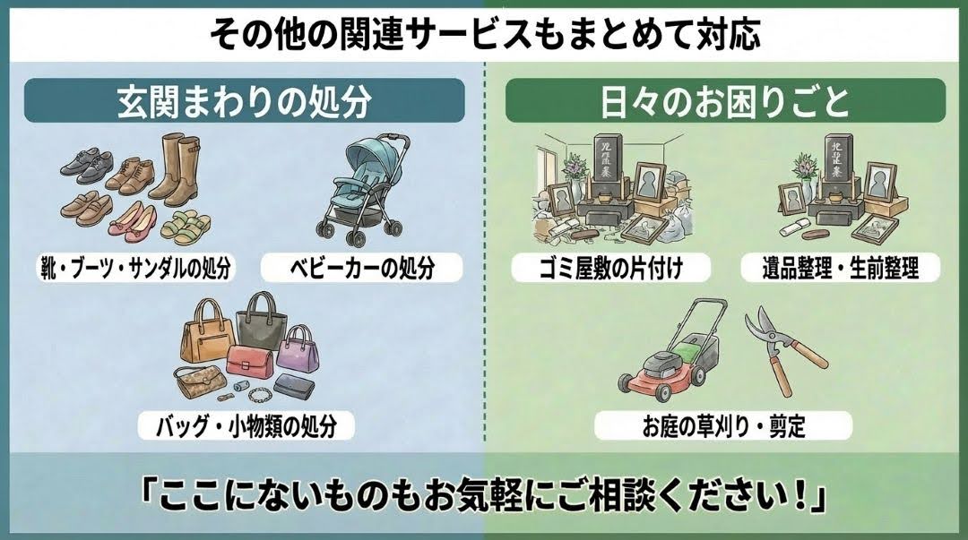 大量の傘・ビニール傘・折りたたみ傘の処分と合わせて、以下の関連サービスも大変ご好評いただいております。特に「玄関まわり」の整理や「不用品の一括片付け」は、不用品処分とセットでご依頼いただくことが多い人気メニューです。