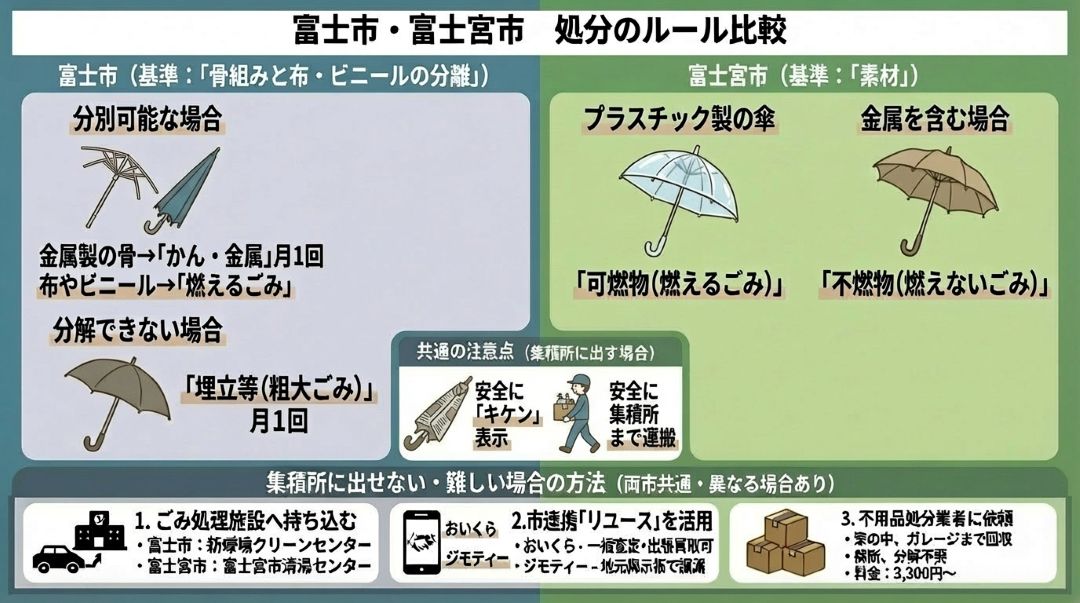 ※富士市・富士宮市では、行政による「自宅までの戸別収集」は原則ありません。以下のいずれかの方法で処分を検討してください。