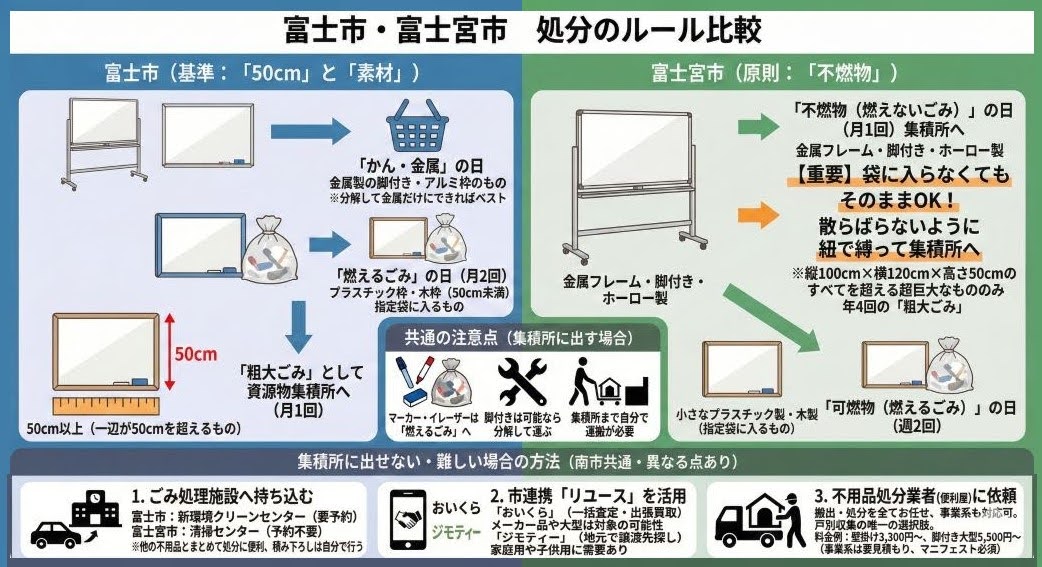 富士市・富士宮市では、大きなホワイトボードは「粗大ごみ」に分類されますが、脚付きのものを解体したり、壁から取り外したりして集積所まで運ぶのは多大な労力がかかります。