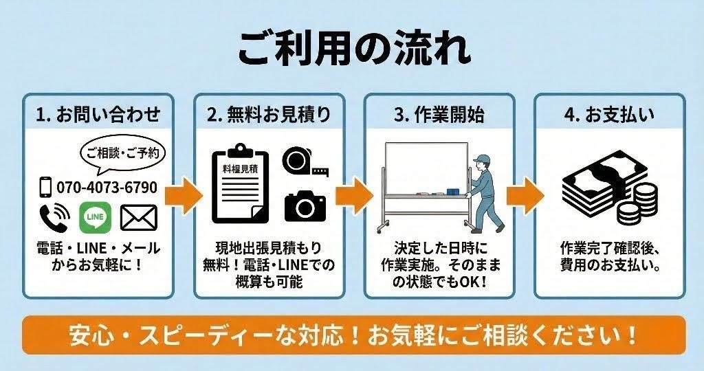 ホワイトボードは金属製のフレームやプラスチックの角、ホーローやスチールの板など複数の素材が組み合わさっており、サイズも大きいため、自治体のゴミに出すには解体や運搬の手間が非常にかかる品目です。「重くて一人では運べない」「取り外し方がわからない」という方は、ぜひお気軽にご相談ください。