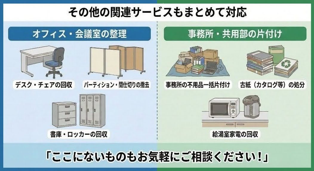 ホワイトボードの処分と合わせて、以下の関連サービスも大変ご好評いただいております。オフィスの移転や閉鎖、会議室の片付けの際にセットでご依頼いただくことが多いメニューです。